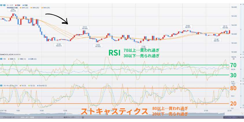 ストキャスティクスやRSIを活用して、売買の過熱感を見ながら、落ち着いて判断していきましょう。
