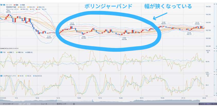 さらにボリンジャーバンドの幅がせまいなら、値動きは小さくなり、幅の反発が起きやすい状況にあります。
