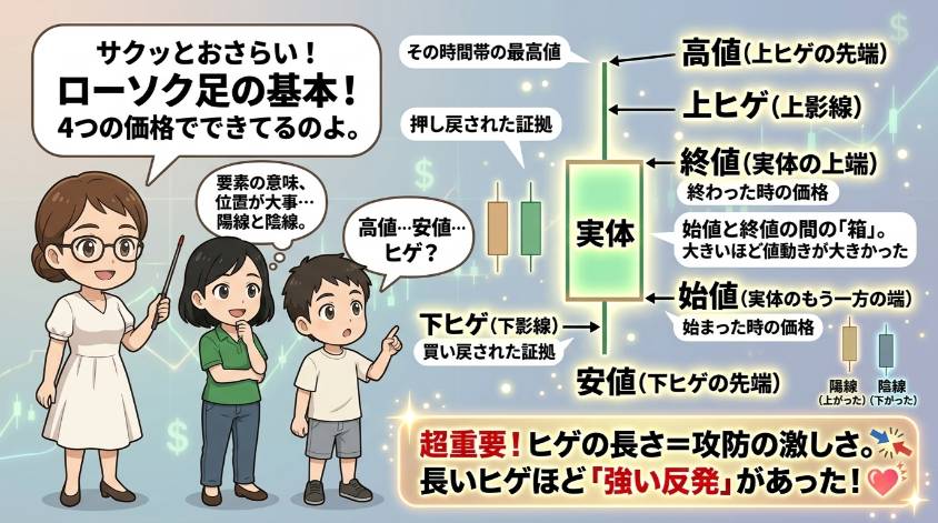 ヒゲの話に入る前に、ローソク足の基本をサクッとおさらいしておくわね。