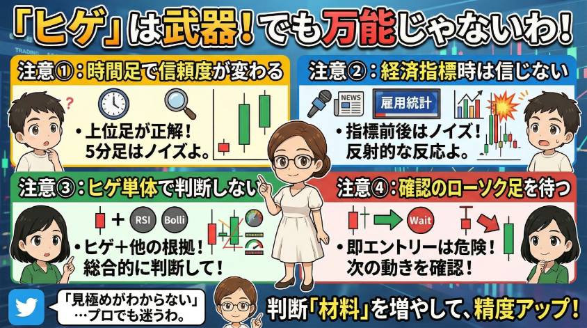 ヒゲは強力なサインだけど、万能じゃないわ。以下の4つは必ず頭に入れておいて。