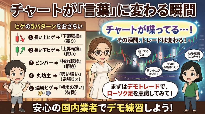 あなたにもきっと、その瞬間が来る。まずはデモトレードで、ローソク足のヒゲを意識しながらチャートを眺めてみて。「あ、ここに長い下ヒゲが出てる。買いの力が強いんだな」そう読めるようになった時、あなたのトレードは確実に変わるわよ。