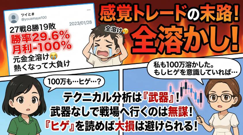 私自身もチャートを読めなかった頃、感覚だけでエントリーして100万溶かした。あの時、ローソク足のヒゲ1本でも意識していれば、あそこまでの大損は避けられたと思うわ。