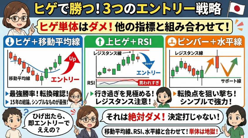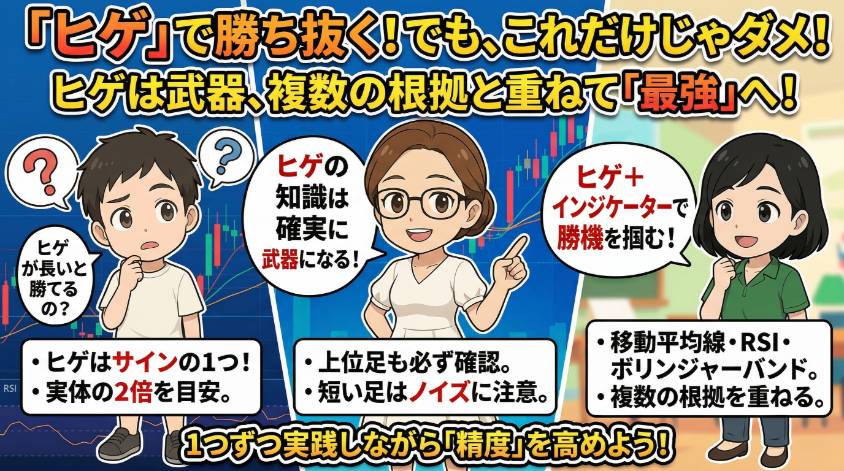 それ一番ダメなやつよ。ヒゲは”サインの1つ”であって”決定打”じゃないの。移動平均線やRSI、水平線と合わせて初めて根拠になるわ。単体で判断すると痛い目見るわよ