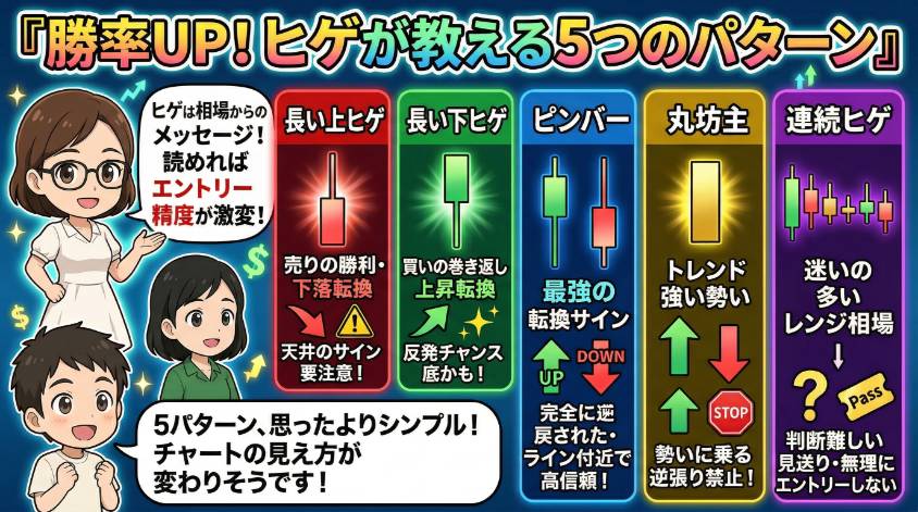 さあ、ここからが本題よ。ヒゲが教えてくれるパターンは大きく分けて5つ。これを覚えるだけで、チャートの読み方が変わるわ。