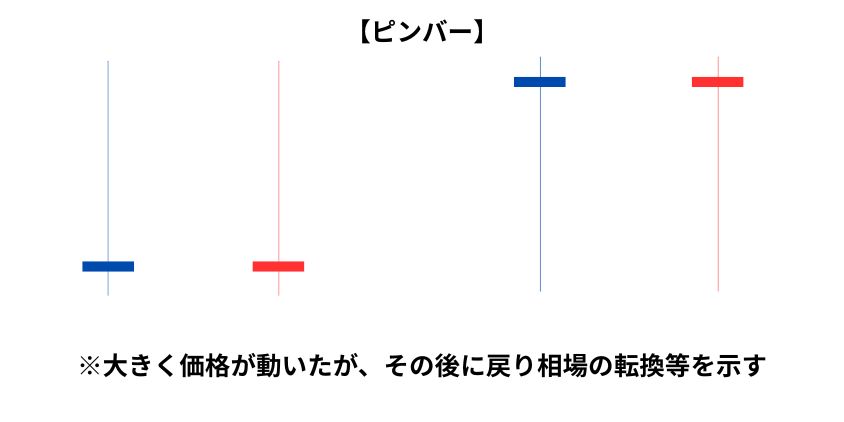 • 上ヒゲが長いピンバー→下落転換のサイン(上がったけど完全に押し戻された→売りの勝ち)