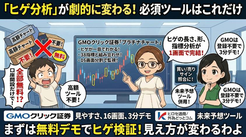 ヒゲを正確に読み取るには、ローソク足が見やすい分析ツールが必要よ。ヒゲの長さや形が一目でわかるかどうかで、分析の精度が変わるから。