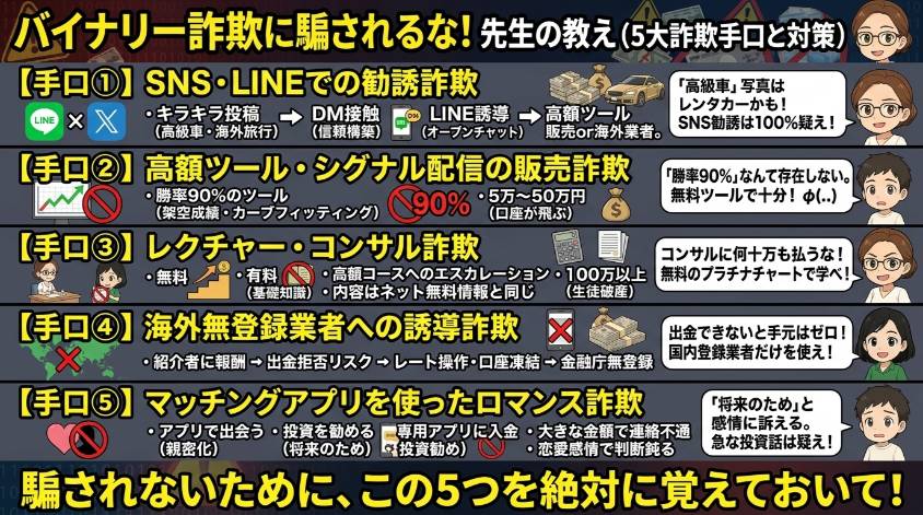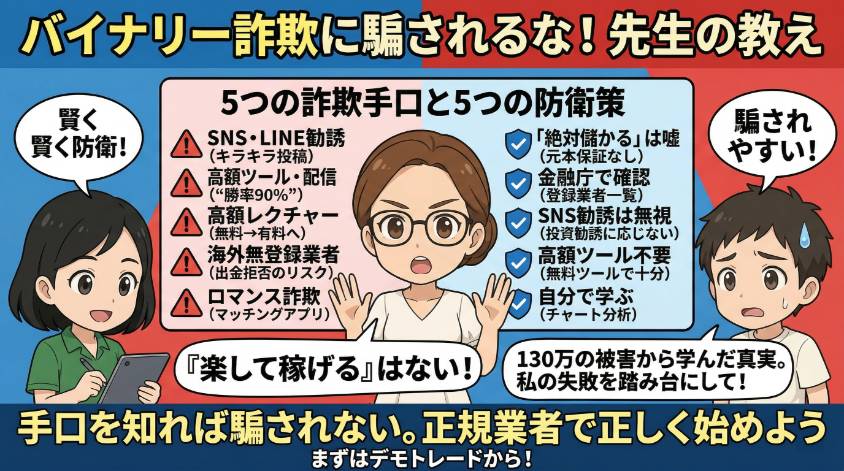 先に言っておくわ。バイナリーオプション自体は詐欺じゃない。金融庁に登録された国内業者を使えば、合法的な金融商品取引よ。でもね、その周辺には巧妙な詐欺が山ほど潜んでるの。