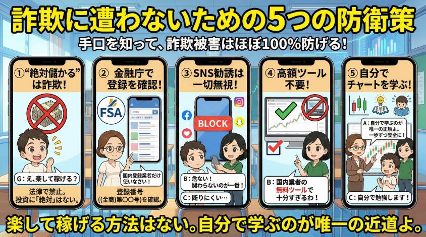 大前提は金融庁登録済みの国内業者だけを使うこと。これだけで詐欺被害のリスクは激減するわ。