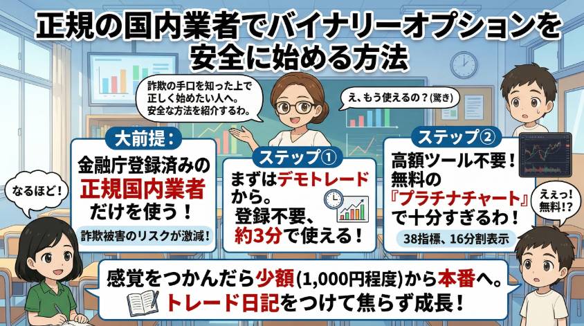 詐欺の手口を知った上で、「正しくバイナリーオプションを始めたい」という人へ。安全に始める方法を紹介するわ。