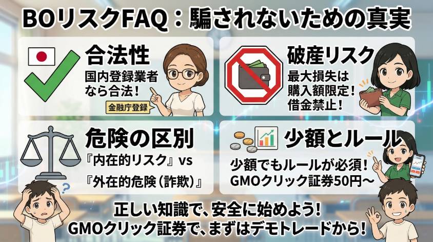 つまり、「バイナリーオプションは危険だ!」って一括りにするのはちょっと乱暴なのよ。「どの危険が、どのレベルで、どう対策できるか」を分けて考えれば、漠然とした不安がスッキリ整理されるわ。