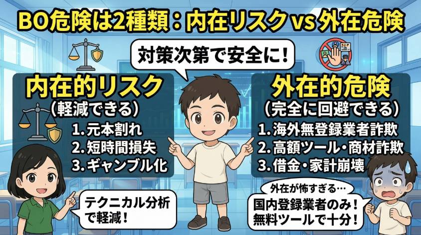 バイナリーオプションの危険性は確かにある。でもそれは2種類に分けられて、正しく理解すれば対策できるものよ。