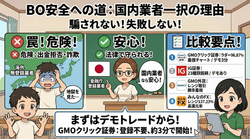 バイナリーオプションの危険性を回避する最大のポイントは、金融庁に登録された国内業者を選ぶことよ。
