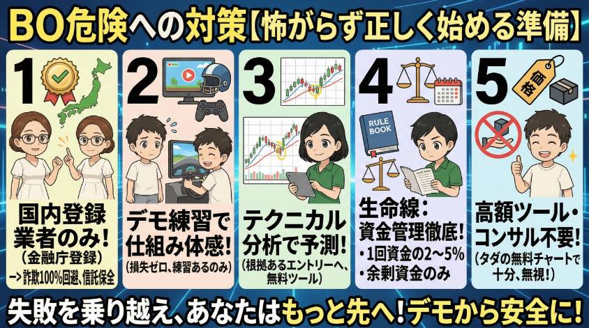 この記事では、バイナリーオプションの5つの危険性と、それぞれの具体的な対策を、私の痛い失敗談とSNSのリアルな被害事例を交えて全部話すわ。「危険だからやめとけ」で終わる記事じゃない。「危険性を知った上で、正しく始めるための記事」よ。