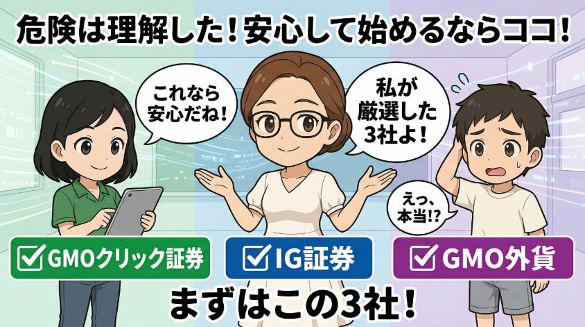 私のおすすめはGMOクリック証券よ。理由は3つあるの。