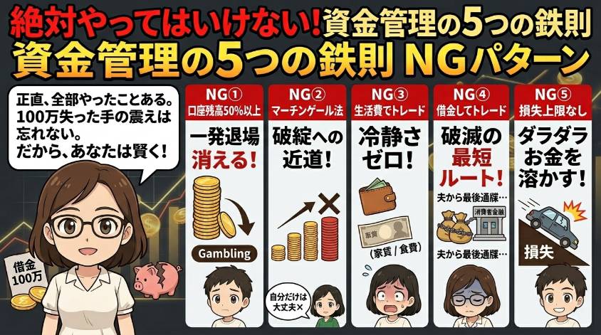 10万円の口座で5万円以上を1回に賭ける。これは「投資」じゃなくて「ギャンブル」。2連敗で口座がほぼ空になる。どんなに「このチャンスは絶対」と思っても、50%以上を1回に賭けるのは一発退場の入口よ。