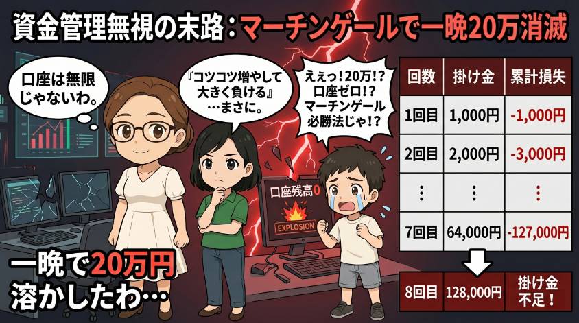 さっき詳しく説明した通り。「理論上は負けない」けど、現実には口座残高に限りがある以上、必ず破綻する。私がこれで一晩20万溶かしたのは前述の通り。「自分だけは大丈夫」って思った瞬間が、一番危ない。