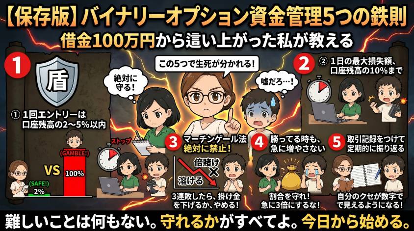 この記事では、バイナリーオプションの資金管理について、私が血を流して学んだ「5つの鉄則ルール」と、口座残高別の具体的な金額プランまで全部公開するね。あなたが私と同じ道を歩まなくて済むように。