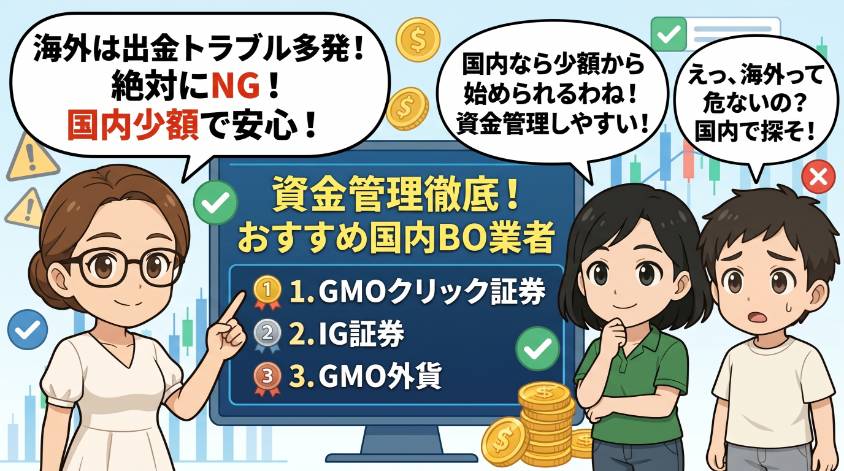 資金管理を実践するなら、少額から取引できる国内業者を選ぶのが大前提。海外の無登録業者は論外として(出金トラブルが多発してるから絶対使わないでね)、国内業者なら安心して資金管理に集中できるわよ。