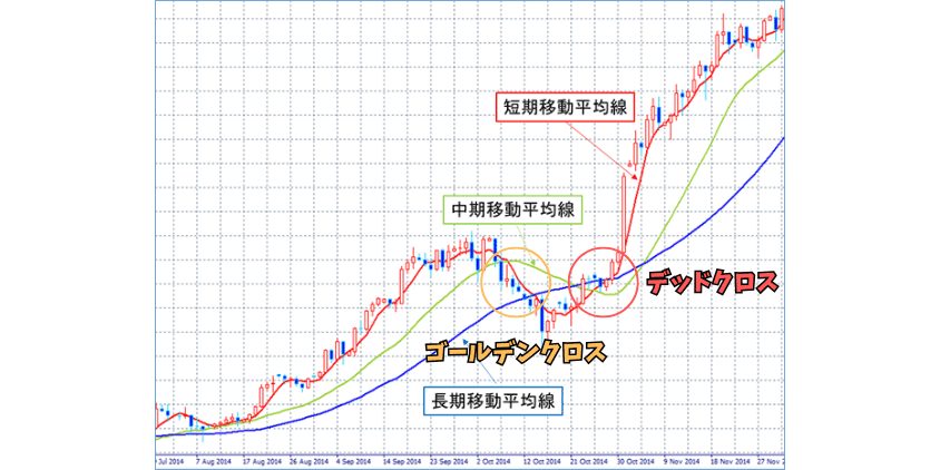 もう一つ覚えておきたいのがゴールデンクロスデッドクロス。短期線が中期線を下から上に突き抜けたらゴールデンクロス(上昇サイン)、上から下に突き抜けたらデッドクロス(下降サイン)。ただし、これだけで判断するのは危険。あくまで「方向性のヒント」として使ってね。