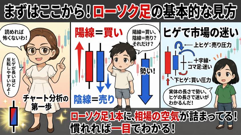 まずはこの基本を覚えて。陽線=買い優勢、陰線=売り優勢。シンプルだけど、これがすべてのチャート分析の土台になるから。