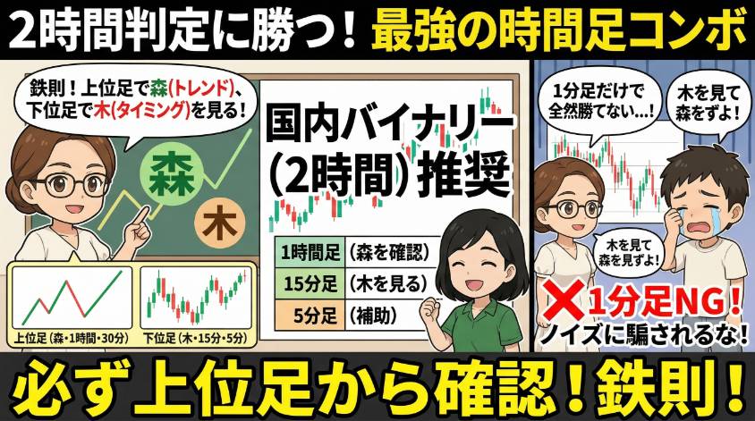 よくある失敗が、1分足だけ見てエントリーすること。1分足は値動きのノイズ(ランダムな上下動)が多すぎて、トレンドの方向を読み違えやすい。必ず上の時間足で全体の流れを確認してから、下の時間足でピンポイントのタイミングを計ってね。