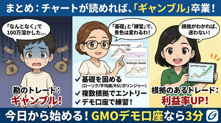 大事なのは、今日から始めること。GMOクリック証券のデモ口座なら3分で開設できるから、この記事を読み終わったらすぐにチャートを開いてみて。ローソク足を眺めるだけでいい。それが「勘のトレード」から「根拠のあるトレード」への第一歩よ。