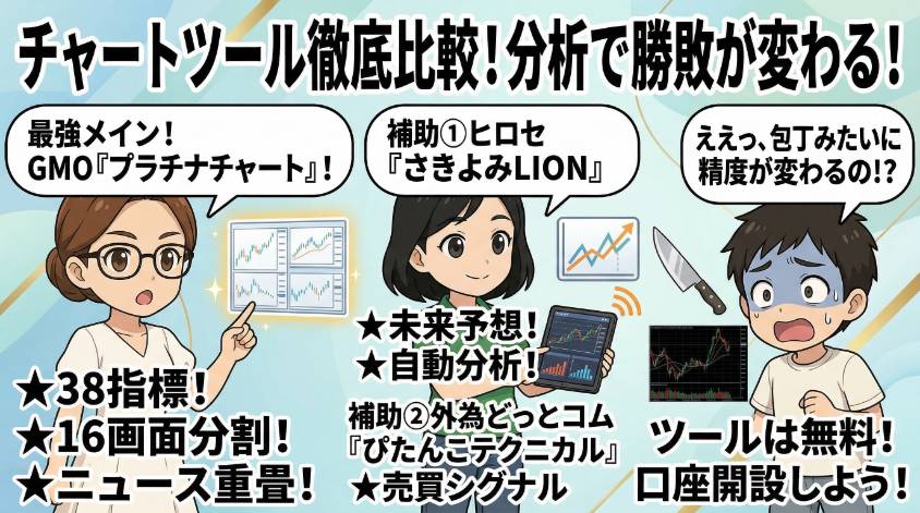 GMOクリック証券のプラチナチャートが最もおすすめ。38種類のテクニカル指標と16画面分割が無料で使える。補助としてヒロセ通商のさきよみLIONチャート(未来予想ツール)も無料。どちらも口座開設すれば使えるから、まずはデモ口座で試してみて。