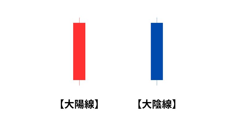 ローソク足の「実体」(太い部分)が長いほど、そのローソク足の時間内に大きく値が動いたことを意味する。大陽線が出たら「買いの勢いがめちゃくちゃ強い」、大陰線が出たら「売りの勢いが圧倒的」というサイン。