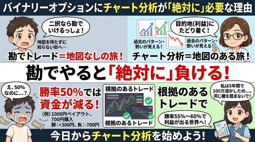 結論から言う。チャート分析なしでバイナリーオプションをやるのは、地図を持たずに知らない街を歩くのと同じ。目的地にたどり着ける確率は限りなく低い。