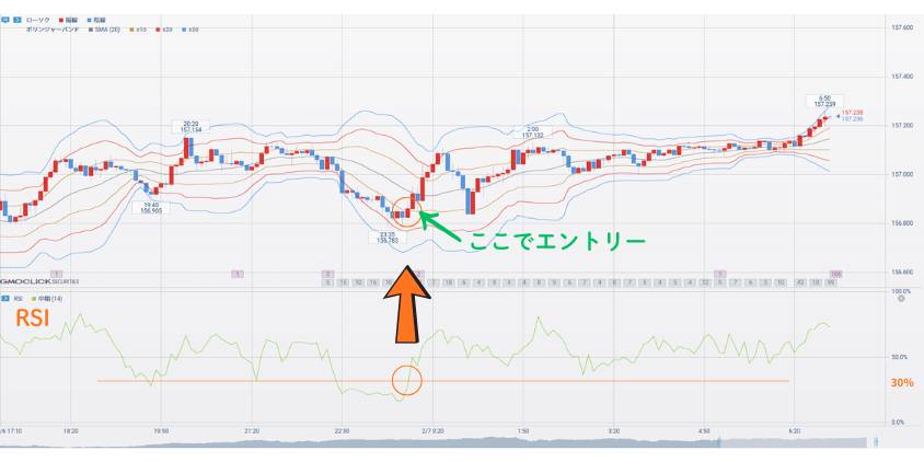 RSIが30以下+ボリンジャーバンド-2σタッチに加えて、その位置で長い下ヒゲのピンバーが出現したら、3つの根拠が揃うことになります。