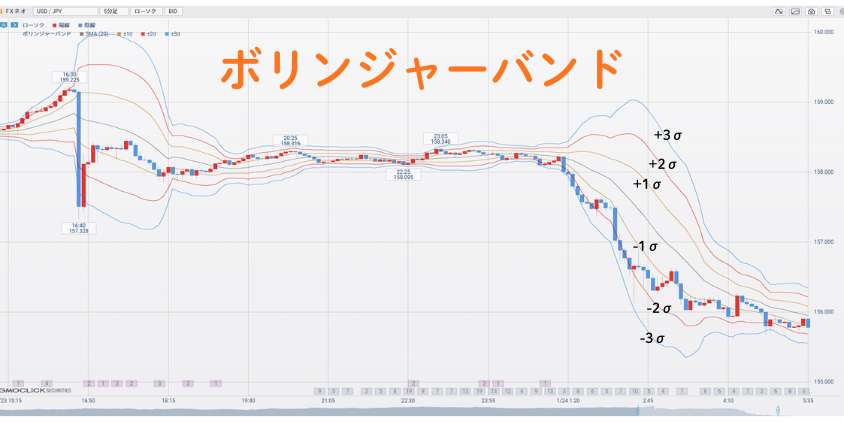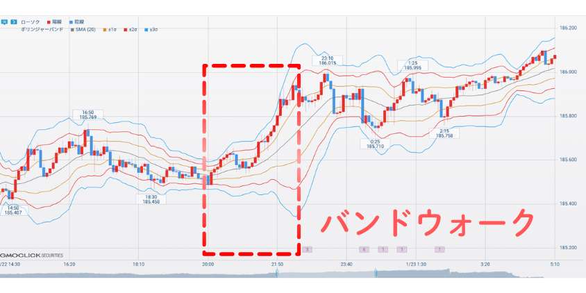 ローソク足がボリンジャーバンドの±2σに沿って移動し続ける「バンドウォーク」が発生している時は、強いトレンドの証拠です。±2σにタッチしたからといって安易に逆張りすると、そのままトレンド方向に持っていかれます。