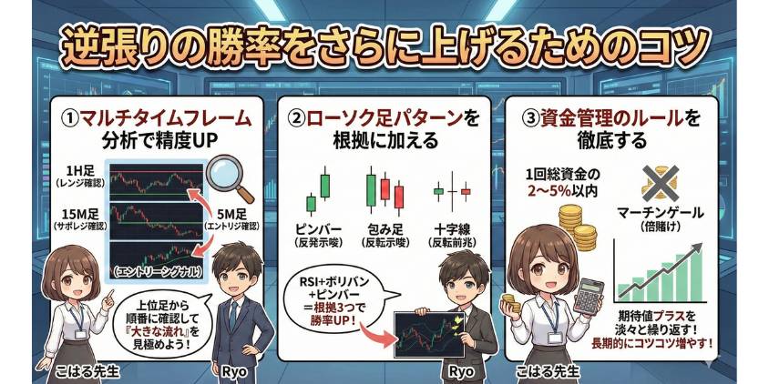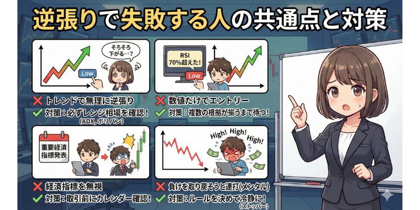 - 手法の前に相場環境を見極める:レンジ相場であることを確認してからエントリーする。これが逆張りの大前提です。