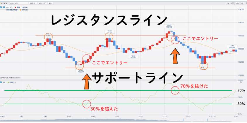 - 5分足でインジケーターの逆張りシグナルを確認してエントリー
