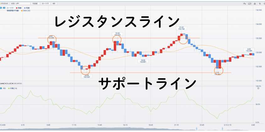 レンジのサポートラインやレジスタンスラインを明確にブレイクした直後は、一方向への強い動きが発生しやすいため、逆張りは危険です。ブレイク後に相場が落ち着いてから判断しましょう。