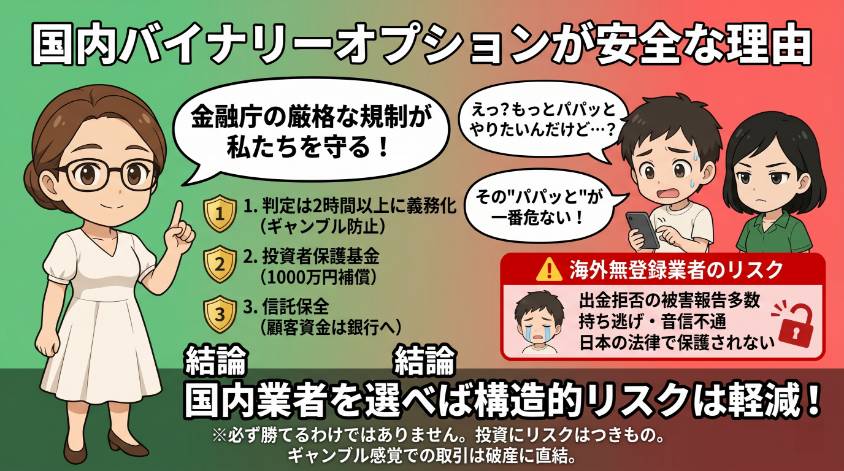 • 国内業者は金融庁の規制で守られている(2時間判定間隔・信託保全・投資者保護基金)