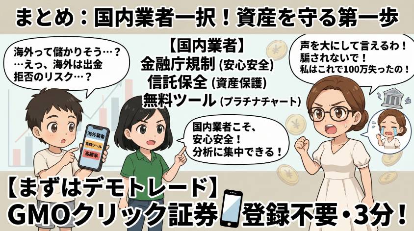 ここまで読んで「国内業者で始めたい」って思ってくれたなら嬉しいわ。国内業者を選ぶことが、あなたの資産を守る第一歩よ。