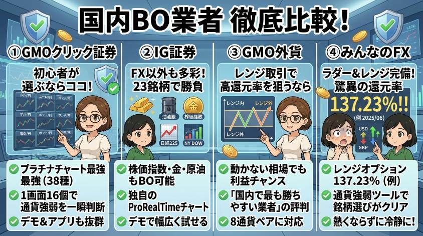 ここが一番迷うところよね。国内の主要バイナリーオプション業者はGMOクリック証券IG証券GMO外貨みんなのFXの4社。それぞれに特徴があるから、あなたの目的や重視するポイントによっておすすめが変わるの。