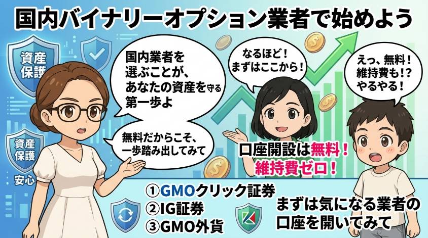 ただし、ひとつだけ注意してほしいのは、「国内業者=絶対に安全」ではないということ。投資にリスクはつきもの。国内業者を選べば「構造的にリスクが軽減される」という話であって、「必ず勝てる」わけじゃないの。ここは冷静に理解しておいてね。