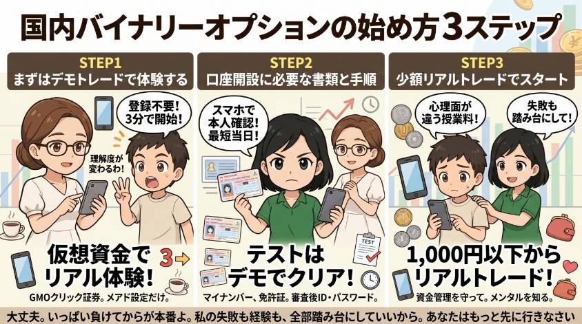 この記事では、国内バイナリーオプション業者の全体像から、主要4社の徹底比較、始め方の具体的なステップまで、私の実体験をベースに全部まとめたわ。「国内業者を選ぶことが資産を守る第一歩」ということが、読み終わる頃にはハッキリわかるはずよ。