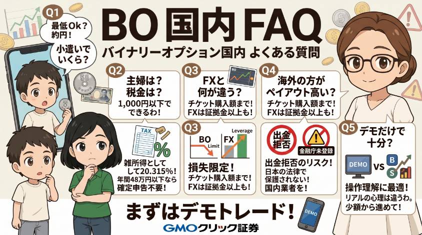バイナリーオプションの国内について多くの方が疑問に感じるポイントをQ&A形式でまとめました。