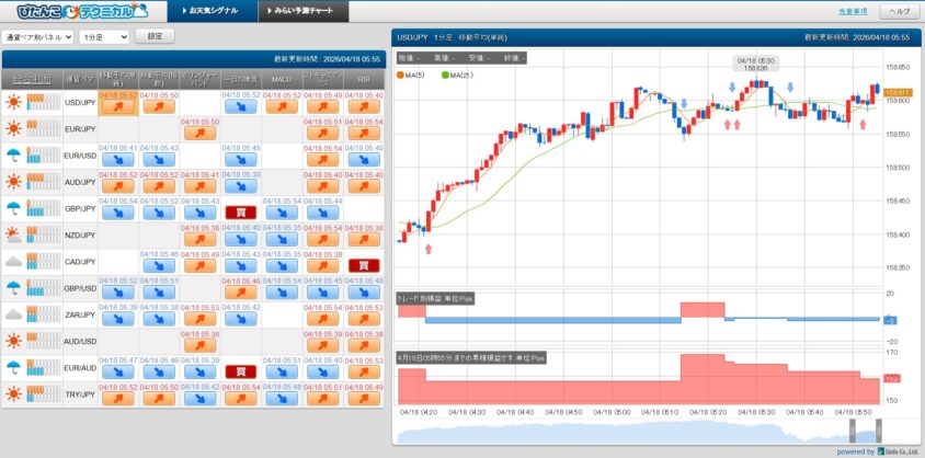 「シグナル配信・自動テクニカル分析」も強力。買い時・売り時のシグナルがチャート上に表示されて、さらに複数のテクニカル指標が今「買い」なのか「売り」なのかを一覧で表示してくれるの。買いが優勢なのか、売りが優勢なのかが一目で判断できるから、特に初心者にはありがたいツールよ。