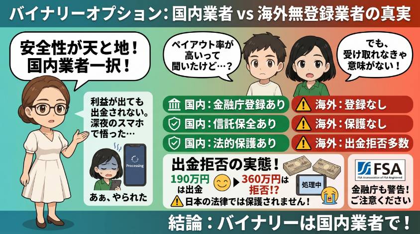 • 海外無登録業者には保護が一切ない(出金拒否リスク・法的保護なし)