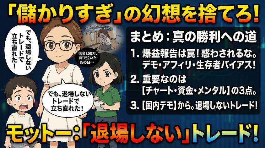 笑ってくれていいわよ。でもだからこそ言えるの。「儲かりすぎ」の幻想で行動すると、最終的にこうなるって。私の授業料は高かったけど、あなたはタダで学べるんだから、ちゃんと活かしなさいね