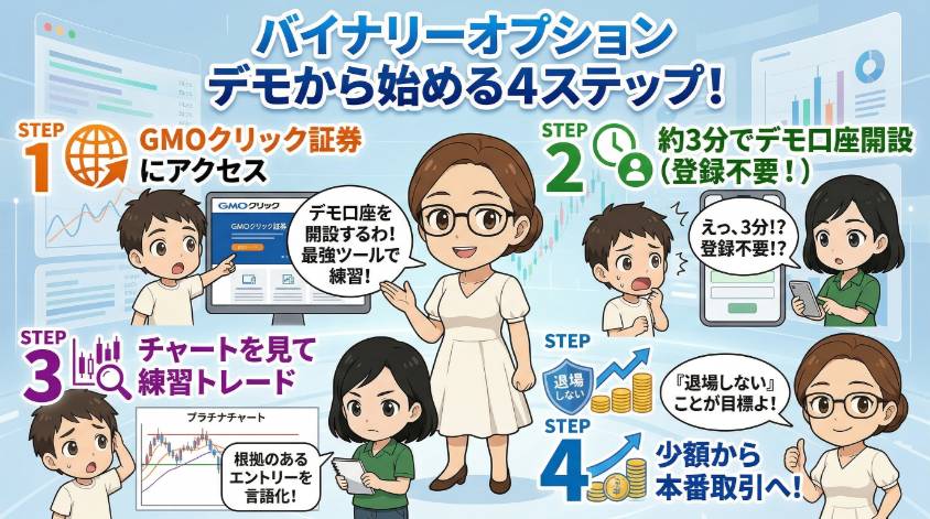 まずはGMOクリック証券のデモトレード(登録不要・約3分で開始)から始めて。チャート分析の基礎(ローソク足・移動平均線・サポレジ)を学びながら練習して、操作に慣れたら少額から本番取引。「儲けること」より「退場しないこと」を最優先にしてね。