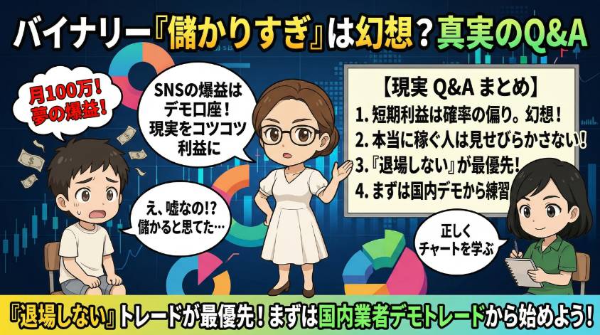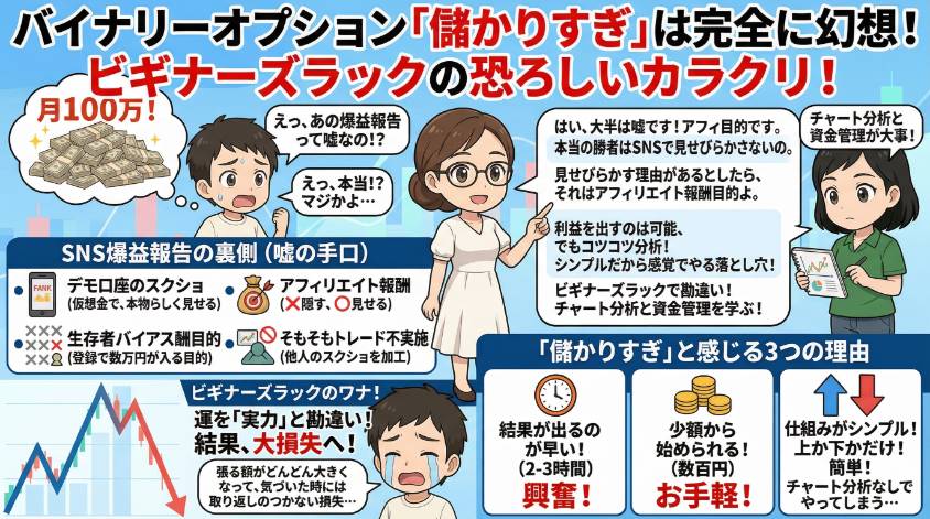 この記事では、「バイナリーオプション 儲かりすぎ」の真実と嘘、SNS爆益報告の裏側、そして本当に利益を出すために必要なことを、私の15年分の失敗と成功を全部さらけ出して書くわ。「儲かりすぎ」の幻想に踊らされて、私と同じ道を歩いてほしくないから。